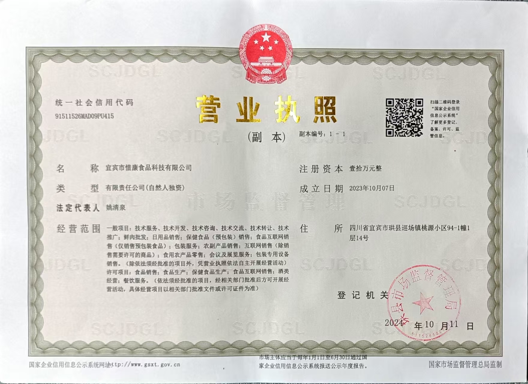 宜賓市惜康食品科技有限公司,位于四川省宜賓市珙縣巡場(chǎng)鎮(zhèn)桃源小區(qū)94-1幢1層14號(hào);